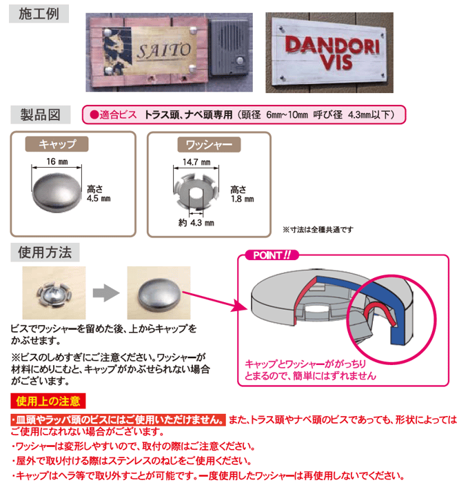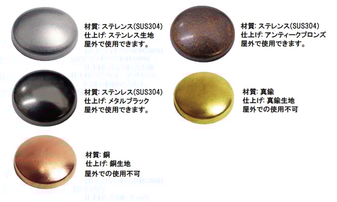 ビスキャップ材質: ステレンスSUS304、真鍮、銅