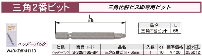 三角化粧ビスMUとウッドデッキ材用ビス三角WDMU専用の三角2番ビット1本入り。三角化粧ビスMUと三角WDMUシリーズの三角頭に使えます。